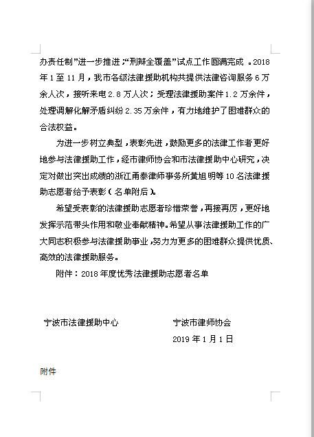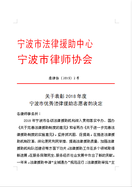 近日,宁波市律协、宁波市法律援助中心对2018年度做出突出成绩的10名法律援助志愿者律师进行表彰。本所黄旭明、邓建功两位律师也获此殊荣。